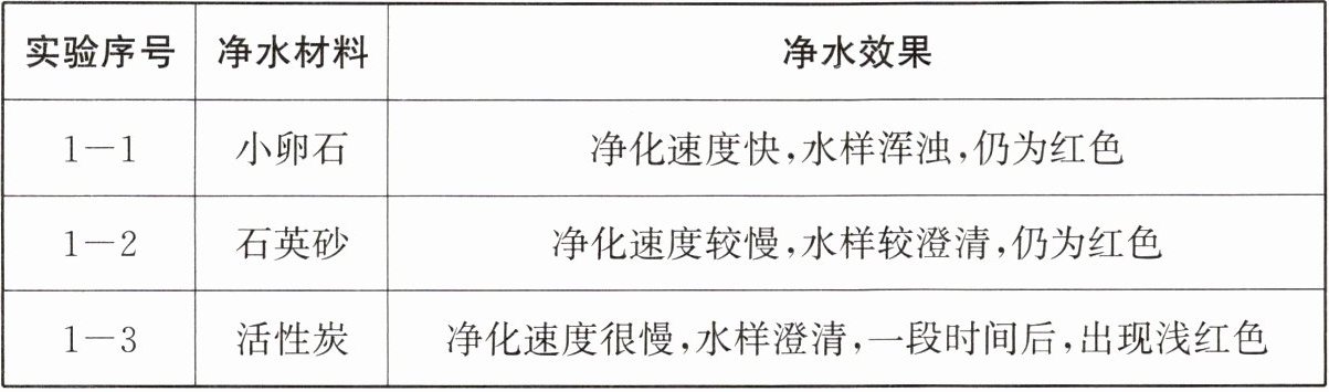 实验1:分别用等量不同材料装填装置(见图),对100mL河水(预先滴入1滴红墨水)进行净化。实验记录如下: