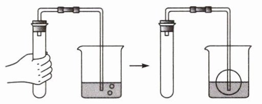 2. 如图所示,某同学采用手握试管外壁的方法检查装置的气密性,若装置的气密性良好,则将手移开一会儿后,烧杯内导管处的现象(画圈部分)是(