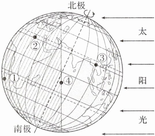 6. 读太阳光照示意图,下列关于①②③④四地的说法,错误的是(