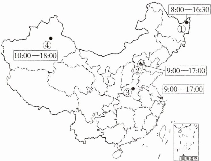 下图为我国部分邮政网点的位置和营业时间示意图。