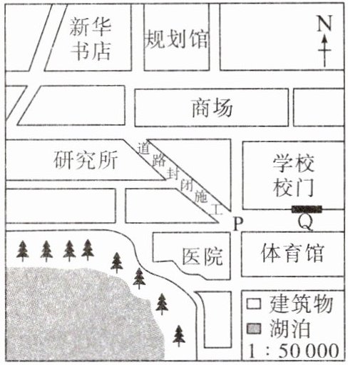 、图例。(3)步骤三:阅读地图。该图中判断方向的依据是____,新华书店在学校的____方向。按步行距离最短原则,同学们行至十字路口P时,考虑实际情况,应在该十字路口向____(填方向)方向行走。