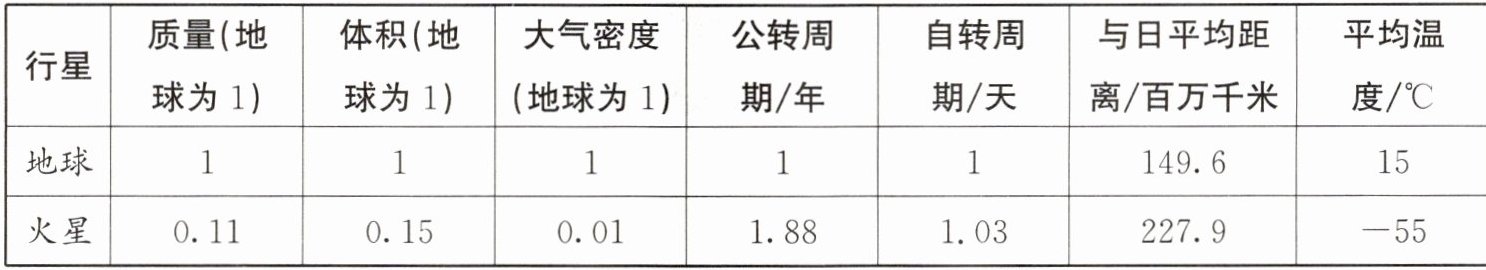 **材料一** 在太阳系中,火星环境与地球环境最为相似,因此人类首先选择火星作为探索生命起源和进化的行星。下表为火星与地球的部分资料对比。