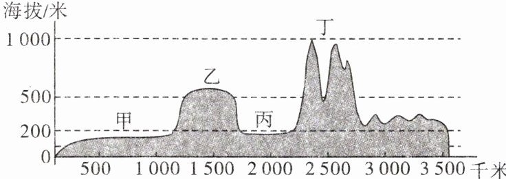 3. 图中甲、乙、丙、丁四地中,属于山地地形的是(