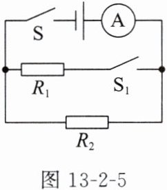 9. 如图$13 - 2 - 5$所示的电路中,电源电压保持不变,$R_{1} = 10\Omega$,$R_{2} = 20\Omega$。当开关$S$闭合、$S_{1}$断开时,电流表的示数为$0.3A$。