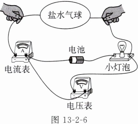 10. 某学习小组将装满盐水的气球连接在如图$13 - 2 - 6$所示的电路中。用手向相反的方向拉扯连接气球的导线,使气球变长(盐水与导线充分接触且气球不破裂)。对这一过程进行分析,下列说法正确的是(