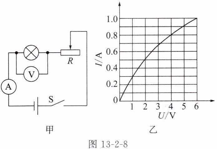 2. 如图 13-2-8 甲所示的电路中,电源电压为 9 V 且保持不变,小灯泡标有“6 V 6 W”的字样,通过小灯泡的电流随其两端电压的关系如图 13-2-8 乙所示。闭合开关 S,下列说法正确的是(