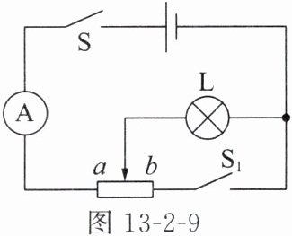 3. 如图 13-2-9 所示的电路中,电源电压恒定,小灯泡 L 标有“6 V 0.5 A”的字样(假设小灯泡的灯丝电阻不变)。闭合开关 S、$S_{1}$,滑动变阻器的滑动头移至 a 端时,电流表的示数为 1 A,小灯泡 L 正常发光;断开开关$S_{1}$,滑动头移至 b 端时,下列说法正确的是(