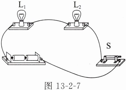 4. 如图 13-2-7 所示,小灯泡$L_{1}比L_{2}$亮,它们的额定电压相同,则通过$L_{1}$的电流