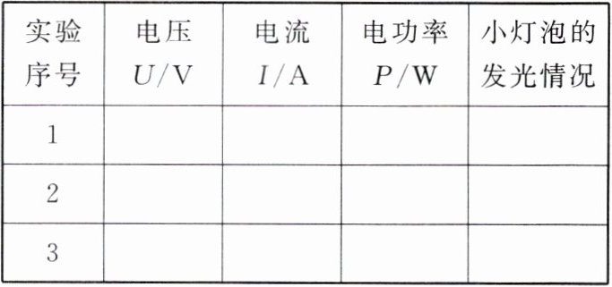 |实验序号|电压$U/V$|电流$I/A$|电功率$P/W$|小灯泡的发光情况|