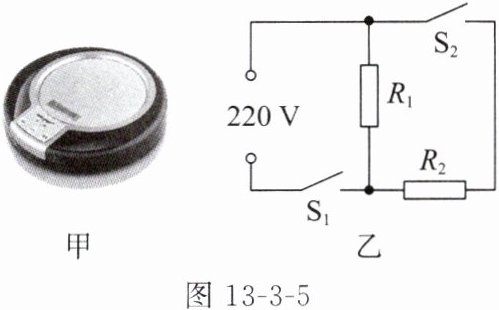 8. 图 13 - 3 - 5 甲是一款电热杯杯垫,有高温和低温两个挡位。杯垫内部的简化电路如图 13 - 3 - 5 乙所示,$ R_{1} $、$ R_{2} $为加热电阻,电源电压为 $ 220 V $,$ R_{1} $的阻值为 $ 2200 \Omega $。闭合开关 $ S_{1} $、$ S_{2} $时杯垫处于高温挡,高温挡的电功率为 $ 66 W $;只闭合开关 $ S_{1} $时杯垫处于低温挡。