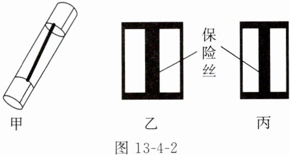 4. 为了防止电流过大导致用电器核心部件被烧毁,很多用电器都装有保险管(如图 13 - 4 - 2 甲所示),图 13 - 4 - 2 乙、丙是熔断电流分别为 10 A 和 20 A 的某种型号保险管的截面图(保险丝的材料和长度相同),那么图