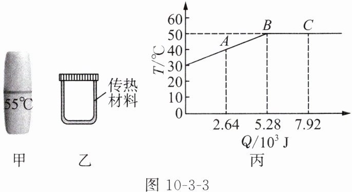 8. (多选)图10-3-3甲为一款新型水杯,将沸水倒入杯中,轻摇几下后,水温便可降至55$^{\circ}C$左右,并能保温3h。图10-3-3乙为其内部结构图,杯壁的不锈钢夹层中有晶体传热材料,其在常温下呈固态,会随着温度的变化发生可逆的固液转换。取0.3kg该晶体材料,对其进行加热,其温度与吸收的热量之间的关系如图10-3-3丙所示。下列分析正确的是(