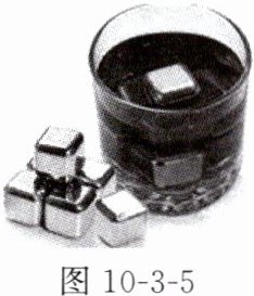 14. 【核心素养|科学态度与责任】饮料中的冰块以前通常是由水冷冻制作而成的,冰块在饮料中熔化后会使饮料味道变淡而影响口感。图10-3-5展示了一种新型不锈钢冰块,其表面是由食品级304不锈钢制成的,里面装有酒精和水的混合液体,该混合液体在温度很低时也不会凝固,可循环使用,也避免了使用不洁净的水源制成冰块对人体健康造成危害。现将四个质量相等的不锈钢冰块冷冻至-15$^{\circ}C$后,迅速放入另一个装有水的杯中,放入不锈钢冰块后水温最终下降到25$^{\circ}C$。已知不锈钢冰块的比热容为$0.42×10^{3}J/(kg\cdot ^{\circ}C)$,每个不锈钢冰块的质量为125g,杯中水的质量为400g。不计热量损失,$c_{水}= 4.2×10^{3}J/(kg\cdot ^{\circ}C)$。