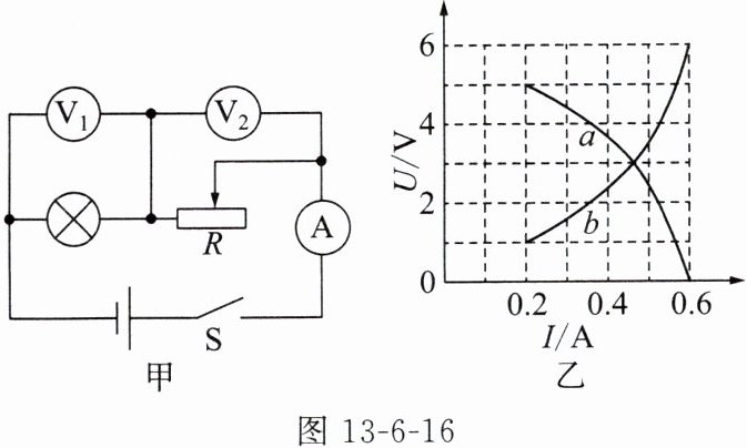 7. (2023·山东临沂中考)如图13 - 6 - 16甲所示的电路中,电源电压保持不变,闭合开关$S$后,将滑动变阻器的滑动头由最右端向最左端移动的过程中,两电压表与电流表的示数变化关系如图13 - 6 - 16乙所示,则(