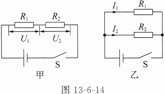 5. 现有$R_1和R_2$两个定值电阻,将它们分别按图13 - 6 - 14中的甲和乙两种方式连接在两个相同的电源上,闭合开关,甲中$U_1:U_2 = 3:1$,则下列结论正确的是(