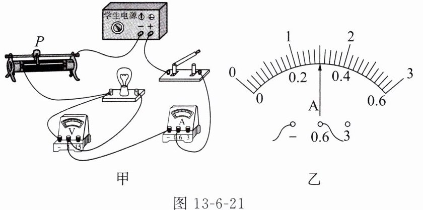 两个接线柱。(2)小云排除故障后,电路如图13 - 6 - 21甲所示,闭合开关,调节滑动变阻器的滑动头,直到电压表的示数为$2.5\ V$,此时电流表的示数如图13 - 6 - 21乙所示,则小灯泡的额定功率为