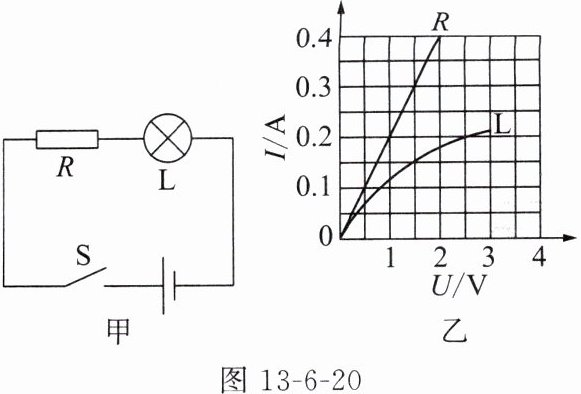 11. 如图13 - 6 - 20甲所示的电路中,小灯泡$L的额定电压为2.5\ V$,开关$S$闭合后,小灯泡正常发光。图13 - 6 - 20乙是通过定值电阻$R和小灯泡L$的电流与各自两端电压的关系图像。小灯泡$L$正常发光时通过的电流为