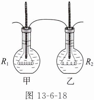 9. (2023·江苏泰州中考)小华将电阻丝$R_1和R_2(R_1 > R_2)$分别浸没在质量和初温均相同的煤油中,把它们按如图13 - 6 - 18所示的方式接入电路中,电路接通后,通过两电阻丝的