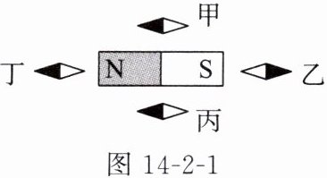 1. 如图14-2-1所示,一条形磁体周围放着可自由转动的小磁针甲、乙、丙、丁,这四个小磁针静止时N极指向正确的是(小磁针涂黑端表示N极)(