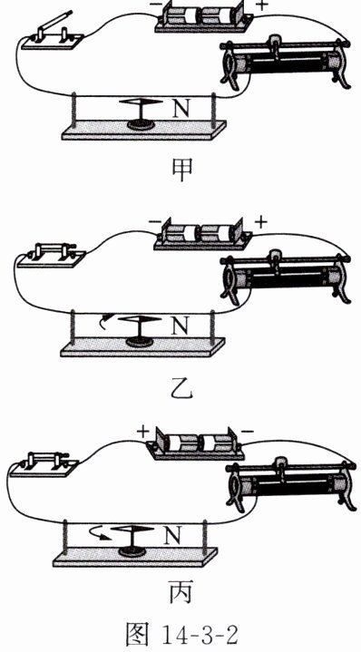 2. (多选)某同学研究电流产生的磁场时,闭合开关前,小磁针的指向如图 14-3-2 甲所示;闭合开关后,小磁针的偏转情况如图 14-3-2 乙所示(箭头表示偏转方向);只改变电流方向,再次进行实验,小磁针的偏转情况如图 14-3-2 丙所示。下列结论合理的是(
