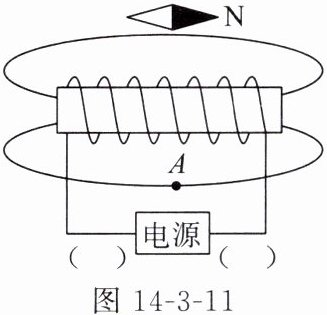 4. 如图 14-3-11 所示,请根据小磁针(可自由转动)静止时 N 极的指向标出 A 处的磁感线方向和电源的正、负极。