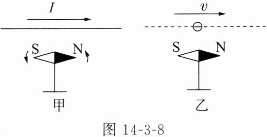 1. 如图 14-3-8 甲所示,在观察奥斯特实验时,小明注意到放置于通电直导线下放的小磁针 N 极向纸内偏转。小明由此推测:若电子沿着水平方向平行地飞过小磁针上方时(如图 14-3-8 乙所示),小磁针也将发生偏转。请你说出小明推测的依据: