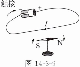 2. 如图 14-3-9 所示,桌面上有一枚可自由转动的小磁针,导线与电池触接前,小磁针静止时