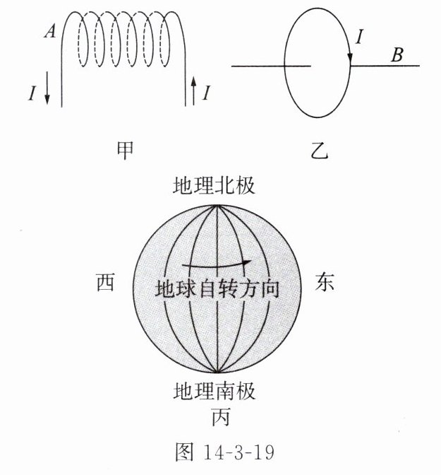 (2) 地球周围存在磁场,有学者认为,地磁场是由地球带电自转形成圆形电流引起的,地球自转的方向为自西向东(如图 14-3-19 丙所示),则形成的圆形电流的方向与地球自转方向