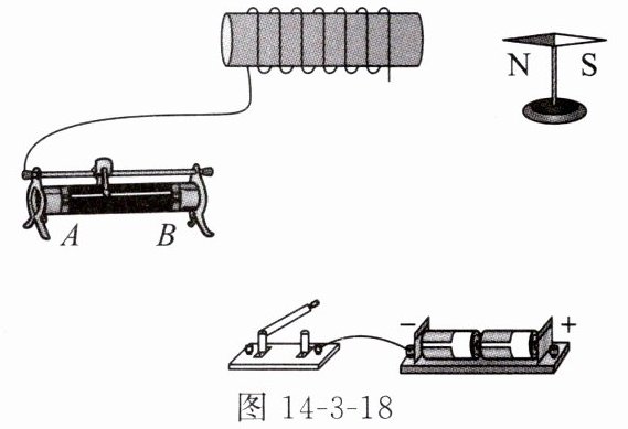 11. 如图 14-3-18 所示,请用笔画线代替导线将实物图补充完整,闭合开关后,要求:①小磁针的指向满足如图所示的方向;②滑动变阻器的滑动头向右端移动时,通电螺线管的磁性减弱。