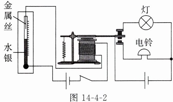 3. 图 14 - 4 - 2 是一种温度自动报警器的工作原理图,在水银温度计中封入一段金属丝,金属丝下端所指示的温度为 90℃。下列说法错误的是(