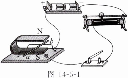 (2)如图 14 - 5 - 1 所示,将导体 $ ab $ 轻轻置于蹄形磁体的两极之间(在导轨上),闭合开关前导体 $ ab $