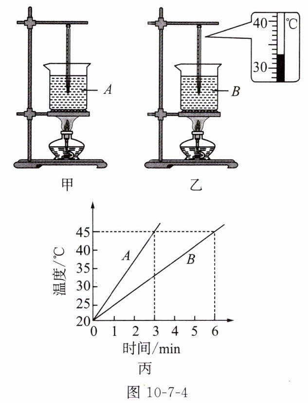 (选填“液体温度升高的多少”或“加热时间的长短”)来反映液体吸收热量的多少。(4)加热一段时间后,液体B的温度如图10-7-4乙所示,为