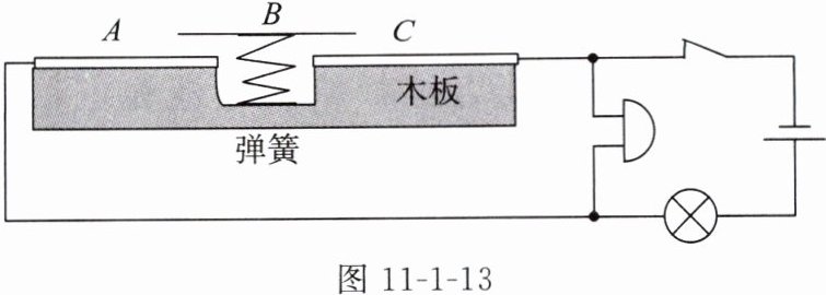 5. 图 11 - 1 - 13 是具有报警功能的文物展示台示意图,该展示台由木板、弹簧、金属片(A、B、C)和报警电路组成。当把文物搬离展示台时,金属片 B 在弹簧弹力作用下与金属片 A、C 分开。下列说法正确的是(