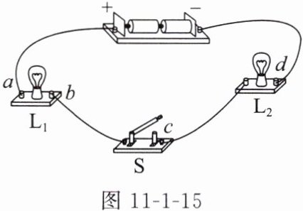 7. 图 11 - 1 - 15 为小华连接的电路,他检查导线连接无误后,闭合开关 S,发现两灯均不发光,于是他用一根导线分别连接到 a 和 b、a 和 c、b 和 c 两点处,灯$ L_1 $和$ L_2 $均不发光;再用导线连接到 c、d 两点处时,灯$ L_1 $发光,灯$ L_2 $不发光,由此判定电路故障可能是(