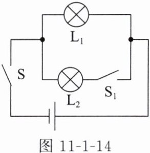 6. 如图 11 - 1 - 14 所示,当只闭合开关 S 时,两灯均不亮;若同时闭合开关 S 和$ S_1 $时,只有灯$ L_2 $亮,则电路中可能出现的故障是(