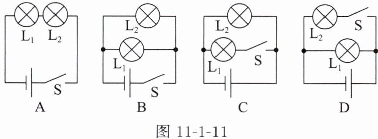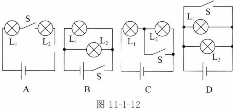 4. 在如图 11 - 1 - 12 所示的电路图中,闭合开关 S 后,两个小灯泡都能工作的是(
