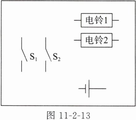 11. 九年级的志愿者想为敬老院的老人设计一个呼叫电路,他们的设想是:同一房间内的两位老人每人单独控制一个电铃,能让值班室的工作人员区分出是哪位老人按铃呼叫的。请将如图 11-2-13 所示的电路原理图补充完整。
