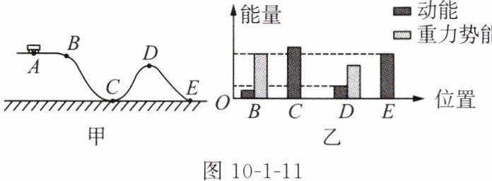 8. 如图10-1-11甲所示,过山车从A点出发,先后经过B、C、D、E点。图10-1-11乙是过山车在B、C、D、E点的动能和重力势能大小的示意图,则过山车在______点的动能最大,在B点的重力势能______(选填“大于”“小于”或“等于”)在E点的动能。在这个过程中,过山车的机械能是______(选填“变化”或“不变”)的。