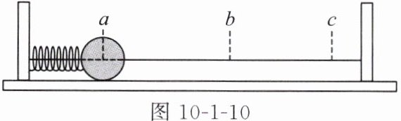 7. 如图10-1-10所示,将弹簧的左端固定,在其右端连接一个小球,把它们套在光滑的水平杆上,a是压缩弹簧后小球被由静止释放的位置,b是小球在弹簧原长时的位置,c是小球到达最右端时的位置。小球从a位置运动到c位置的过程中,在______(选填“a”“b”或“c”)位置的机械能最大;从b位置运动到c位置的过程中,小球的动能转化为弹簧的______。