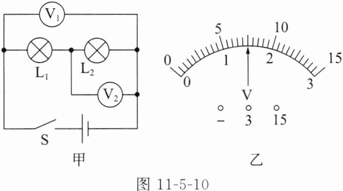 9. 如图11-5-10甲所示的电路中,当开关S闭合后,电压表$V_1、$$V_2$的指针偏转情况均如图11-5-10乙所示,则灯泡$L_1$两端的电压为