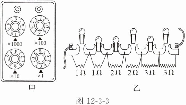 Ω。插孔式电阻箱的读数方法是:拔出的铜塞所对应的电阻丝的阻值相加,就是它接入电路电阻的阻值。如图 12 - 3 - 3 乙所示的电阻箱接入电路电阻的阻值是6
