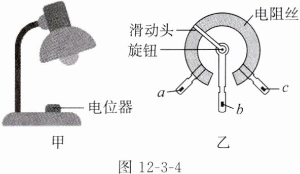 4. 如图 12 - 3 - 4 所示,甲为亮度可调的台灯,电位器是调节其亮度的装置;乙为电位器的内部结构示意图,a、b、c 是它的三个接线柱,旋钮带动滑动头转动。若顺时针旋转旋钮时灯泡发光变亮,则需将