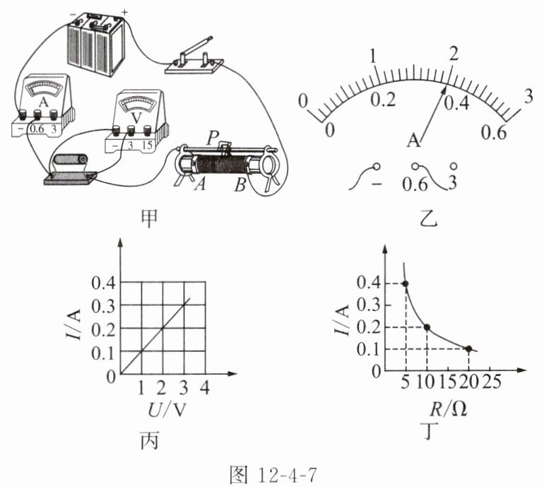。(4)小明根据实验数据绘制了I-U和I-R图像,分别如图12-4-7丙、丁所示。由此可以得出实验结论:在导体电阻一定的情况下,通过导体的电流跟这段导体两端的电压成