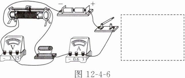 5. 图12-4-6是“探究电流与电压、电阻的关系”的实物电路,其中有一根导线连接错误,请你在错误的导线上画“×”,并画出正确的导线。根据改正后的实物电路,在虚线框内画出对应的电路图。