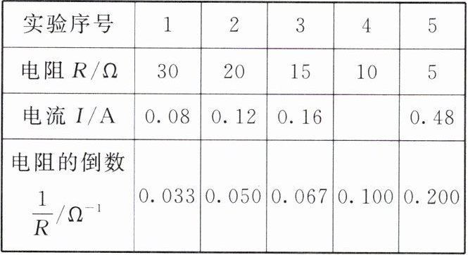 |电阻的倒数$1/R/Ω⁻^1$|0.033|0.050|0.067|0.100|0.200|