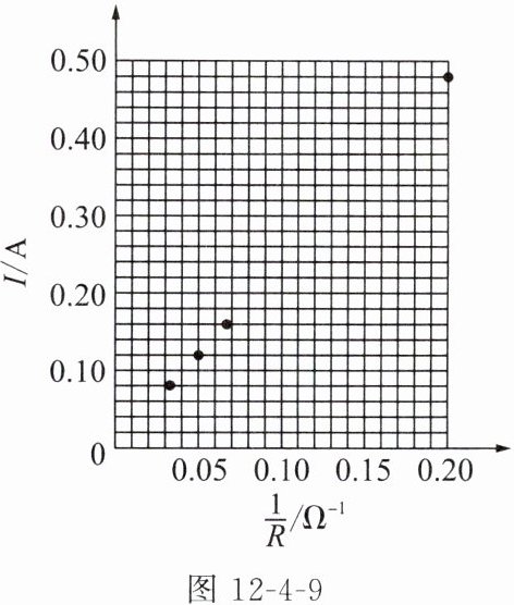 A。(3)为了更精确地描述I与R的关系,在表中增加了1/R的数据,并根据I、1/R的值在如图12-4-9所示的坐标系中描出了相应的点,请你补充第4次的实验数据点,并作出I-1/R图像。