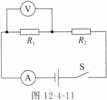 3. 如图 12 - 4 - 11 所示的电路中,电源电压为 $ 6 \, V $,$ R_1 = 4 \, \Omega $。闭合开关 $ S $ 后,电压表的示数为 $ 2 \, V $,则电流表的示数为
