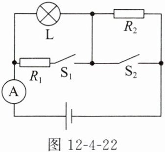 12. 如图 12 - 4 - 22 所示的电路中,灯泡 $ L $ 的电阻 $ R_{L} = 12 \, \Omega $(忽略温度对灯泡电阻的影响),灯泡 $ L $ 正常发光时的电压为 $ 12 \, V $;电阻 $ R_2 = 12 \, \Omega $。当开关 $ S_1 $、$ S_2 $ 都闭合时,电流表的示数为 $ 1.2 \, A $,这时灯泡 $ L $ 正常发光。