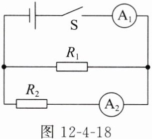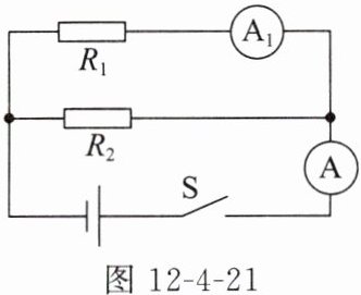 11. 如图 12 - 4 - 21 所示的电路中,电源电压保持不变,电阻 $ R_1 = 15 \, \Omega $。闭合开关 $ S $,电流表 $ A_1 $ 的示数为 $ 0.8 \, A $,电流表 $ A $ 的示数为 $ 1.2 \, A $。