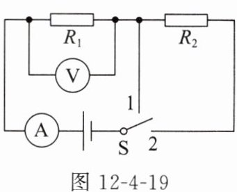 9. 如图 12 - 4 - 19 所示的电路中,电源电压保持不变。当开关 $ S $ 接 $ 1 $ 时,电压表的示数为 $ 6 \, V $,电流表的示数为 $ 0.6 \, A $;当开关 $ S $ 接 $ 2 $ 时,电压表的示数为 $ 2 \, V $。据此可知,电源电压为